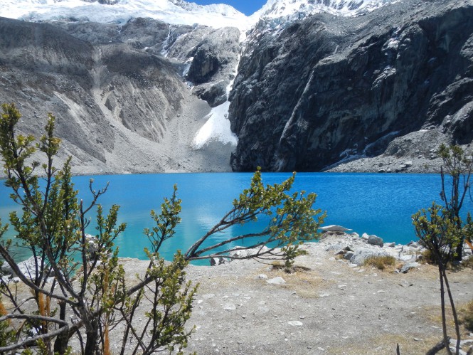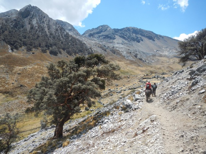 Depois do almoço, com mais duas horas chegamos em Huatiaq, nosso acampamento a 4.253 m. No fundo do vale o Raju Collota, o Diablo Mudo (5.350 m) montanha que muitos escalam para ter uma aventura na neve.