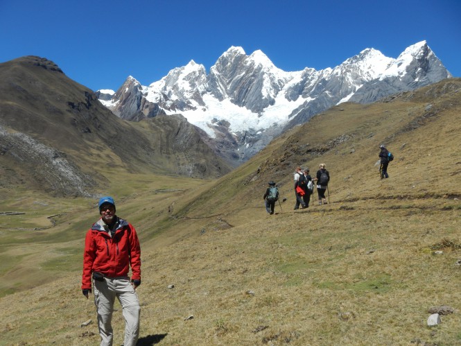 Descida tranquila. Com pouco mais de uma hora entramos num vale a direita, a Quebrada do Rio Janca e o espetáculo começou: diante de nos, na direção SO - Sul uma vista incrível dos nevados Jirishanca, Rondoy e Yerupajá.