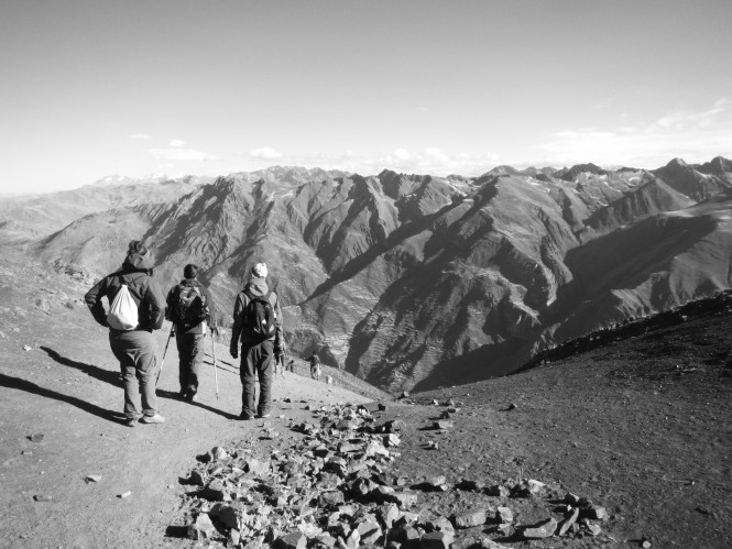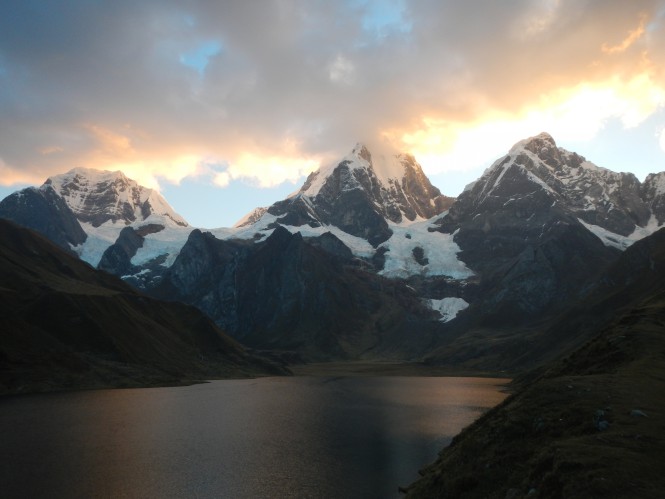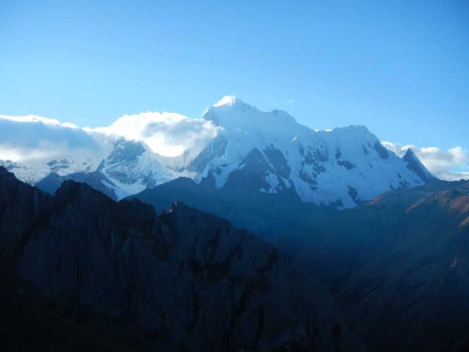 Partimos na escuridão. Estava tão frio que continuei usando meu casaco de duvet. Uma lenta fila indiana descia o vale, todos com as headlamps acessas. Após meia hora, o dia já clareando, começamos a subir para cruzar a Punta Mancan. Um mesmo ritmo lento, pois subíamos todos juntos. A vista do Yerupajá ao alvorecer era muito bonita.