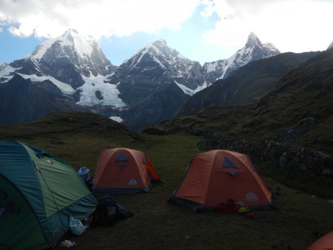 Prosseguimos até chegarmos na Laguna Carhuacocha, com uma visão incrível do Yerupajá Chico e do Yerupajá. O acampamento ficava em um platô acima do lago. Um dos locais mais bonitos do circuito. Banheiros aceitáveis e pias com água encanada completavam o luxo do lugar.