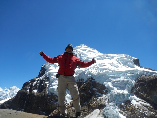 Renato com o Siula Grande ao fundo, centro, cenário de uma das mais impressionantes e dramáticas histórias do montanhismo mundial.