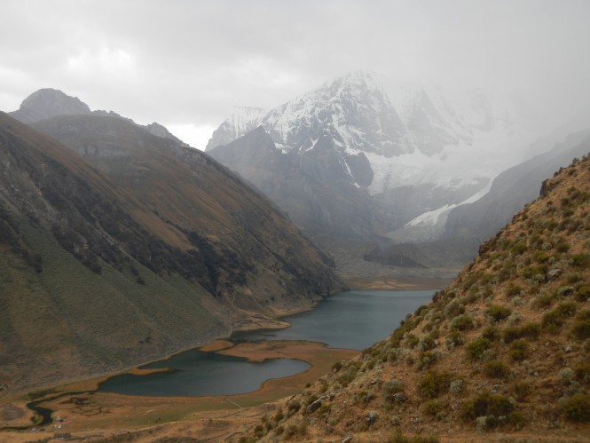 A descida pela Quebrada Huacrish foi deliciosa. Rajadas de granizo volta e meia nos atingiam. A chegada ao mirante da Laguna Jahuacocha foi o momento mais especial do trekking. O Rondoy envolto em nuvens de tempestade, o granizo caindo, a laguna e o acampamento Incahuain lá embaixo. Uma beleza selvagem, única. Apesar do granizo, não queria sair dali.Enfim, tinha de descer. O acampamento é um dos mais bonitos do circuito. O rio de desague das lagunas Jahuacocha e Solteracocha era cristalino e tinha algas no fundo. O pessoal pescava trutas vendo os peixes na água.