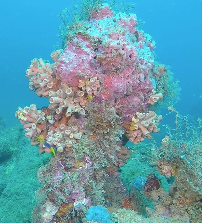 Muito coral sol impregnado nas rochas, espécie invasora que chegou presa na estrutura das plataformas de petróleo. Agora está bem disseminado neste local.
