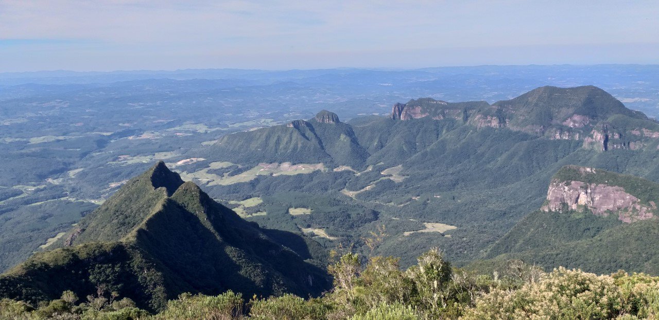 Uma pequena subida por um bosque e ligeira descida nos deixava no platô onde estava o cânion Laranjeiras. Caminhada de apenas 30 minutos. Vista magnífica. Podíamos ver ao Norte o Morro da Igreja onde ficam os radares do Sindacta e a parte regulamentada do PN São Joaquim, que por trapalhadas burocráticas estava fechada para o público já faz um bom tempo. Ali também era parte do Parque, mas uma área não regulamentada, o que permitia fazermos algumas atividades, entre elas o trekking e o camping selvagem.