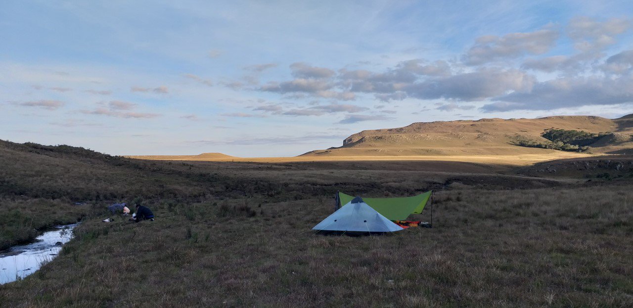 Banho gelado um pouco antes do sol desaparecer por detrás do morro. A temperatura rapidamente caiu. Jantamos no escuro. Ao lado do acampamento havia uma floresta de pinus. Lembramos de um vídeo recente que mostrava uma suçuarana andando tranquilamente num reflorestamento de pinheiros em Lagoa Vermelha/RS, a apenas 100 km de Veranópolis. Edver comentou que nos dois, enroladinhos nos nossos bivaques, eramos tacos mexicanos que a onça parda poderia escolher a gosto.