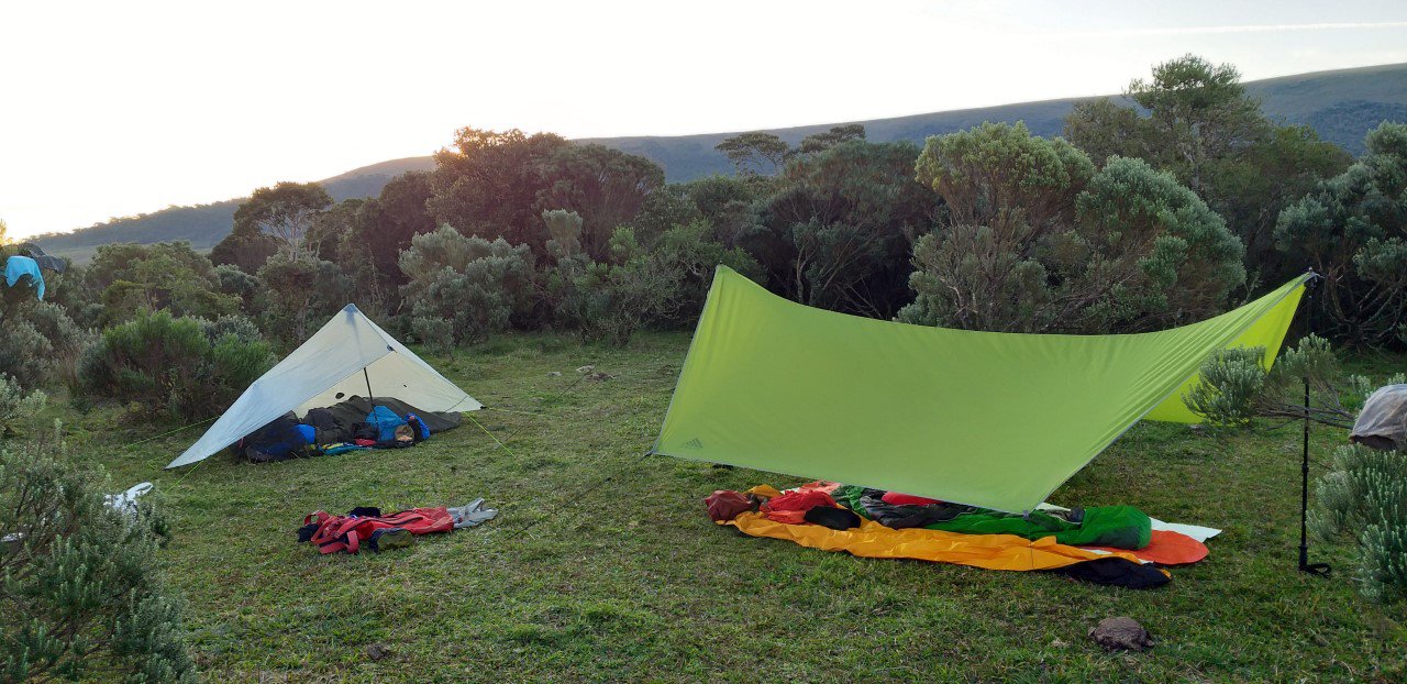 Edver armou sua tarp Hexagon da Zpacks, feito com DCF (Dyneema Composite Fabric). Seu abrigo pesava apenas 110 gramas!! Mas era um projeto minimalista, como podem observar na foto. A minha, de cor verde, pesa cerca de 800 gramas, mas tem área coberta maior. Entretanto no quesito resistência ao vento a dele dava de 10 a zero. O formato hexagonal bate até mesmo nas tendas autoportantes.