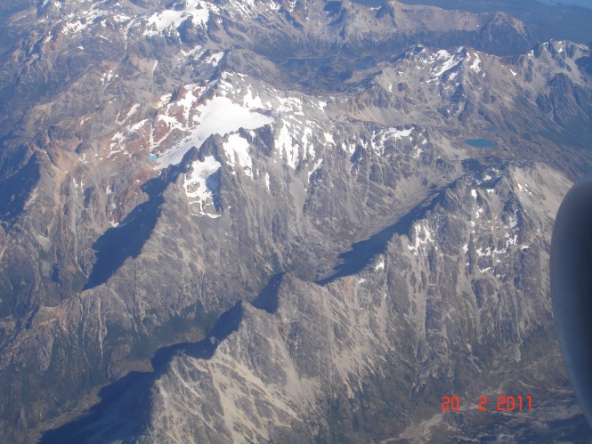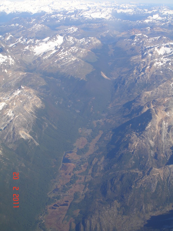 Tive muita sorte, pois cheguei em USH num dia de sol lindo, sem nuvens. Assim, da janela do avião, lado direito, pode observar parte do roteiro que iria seguir no Circuito Sierra de Valdivieso. Tenho o hábito de sempre estudar no mapa e no Google Earth o trajeto, antes da viagem. Foi fácil identificar da janela as referências geográficas. O avião passou praticamente por cima do Passo Bebán.