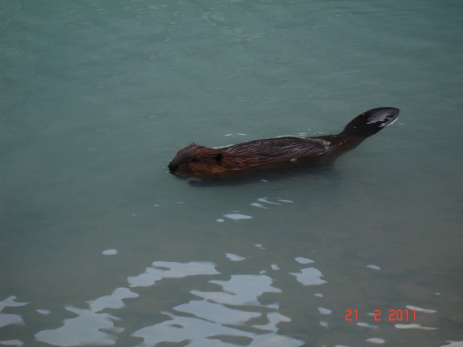 Comi a beira da laguna e apareceu um castor, possivelmente jovem. Nadava de um lado para a outro, paralelo à praia, me observando. Ou são animais curiosos ou os turistas atiram comida para eles (péssima prática), daí eles ficarem próximos. Saquei fotos. Mais tarde peguei um belo por do sol. A laguna Esmeralda nesta ocasião deveria se chamar laguna Rubi.