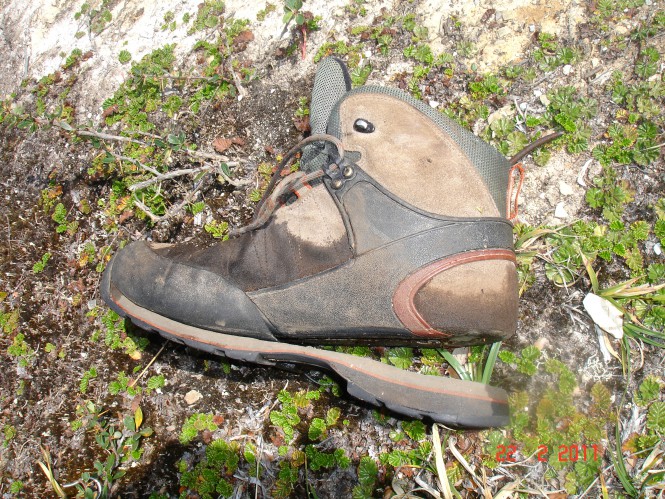 A culpa na verdade era minha. Comprei a bota em 2005, creio, e fazia parte de um lote defeituoso (ver tópico botas Salomon) e já tinha soltado a sola uma vez. Mas a Sapataria do Futuro em Salvador/BA tinha feito um bom trabalho de vulcanização e acreditei que agüentava. Só que tudo tem um prazo de validade, não é mesmo? O problema que sempre achei a bota muito confortável e relutei em aposentá-la. Mas uma bota sem sola é problema grave num trekking em área desabitada e montanhosa.