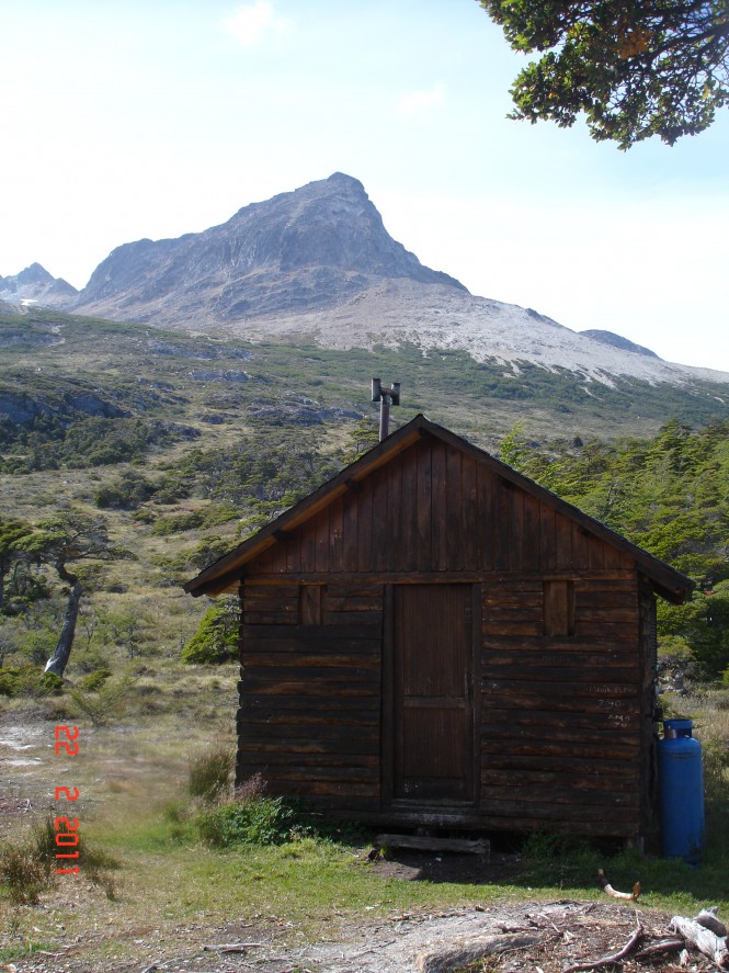 Cheguei bem cansado no fundo do vale. Para variar, sem trilha em vários trechos. Passei por um lugar bonito no meio da mata de lengas, com um abrigo de pescadores/caçadores, feito por troncos de árvores encostados numa árvore formando uma oca em formato de cone. Os índios Onas utilizavam este estilo de habitação. Enrolavam peles para vedar os espaços entre os troncos. Pensei em parar ali mas ainda era cedo. Dava para continuar mais um pouco.