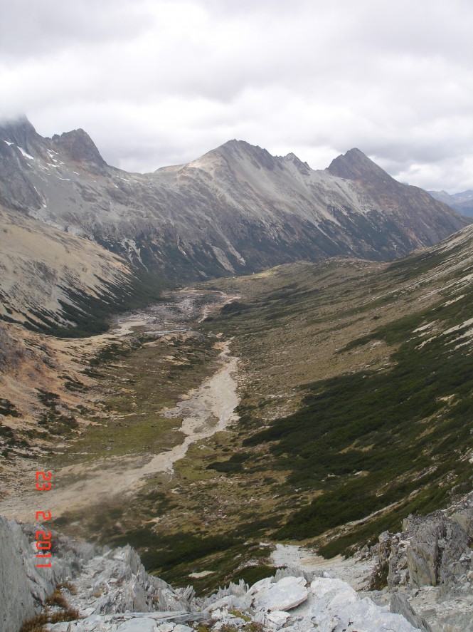 Levantei 07 horas e 08:30 parti. Passei por um local lindo para acampar, apenas 5 minutos de onde estava. Logo depois um córrego, o primeiro dos quatro que despencam dos vales a esquerda do Carbajal, alimentando o rio Olivia.