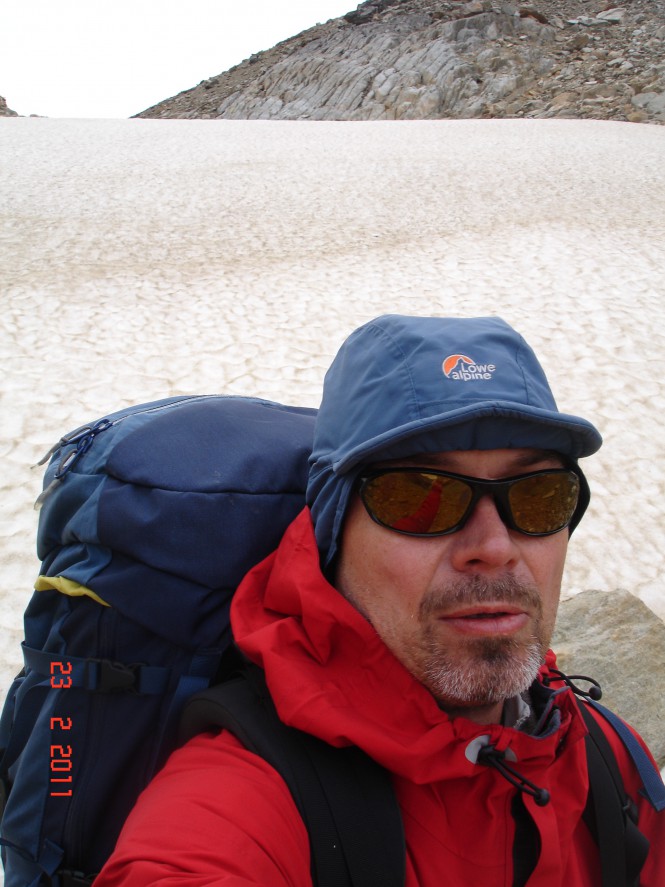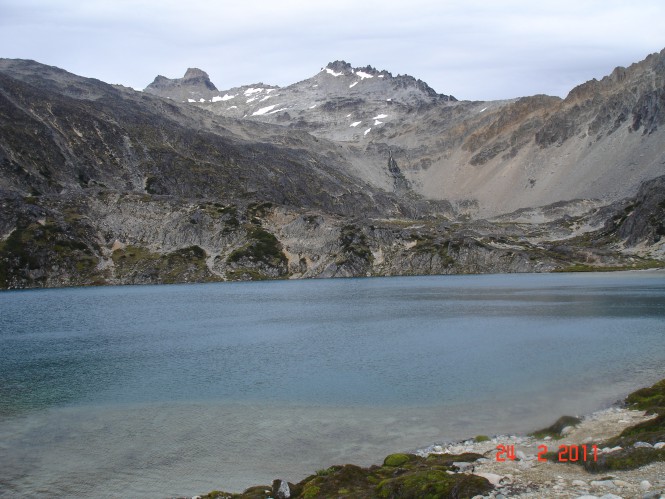 Não achei o lago bonito. E o lugar era bem exposto aos ventos fortes. Não me sentiria nada tranquilo em montar uma tenda ali. Segui para a margem SO onde um riacho indicava por onde deveria começar a subir para o passo Mariposa. Vi um passo com um manchão de neve e rumei para lá. Pegadas confirmavam o rumo. Beleza, não era tão alto assim.