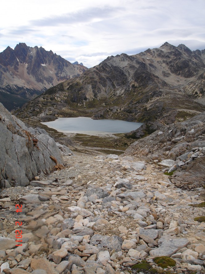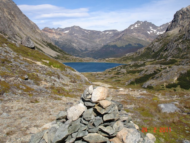 Cheguei cansado num platô gramado de azorelas. Para trás uma bonita vista do lago Fagnano. Descansei e procurei ao longo do platô indício de trilha. Olhando para baixo reparei que havia um boulder com uma pedra em cima, exatamente a indicação que o guia LP dava para o começo da trilha lá embaixo. Ao lado, de fato, tinha uma trilha subindo. Se ao invés de ter seguido para a mata houvesse lido o roteiro e procurado o boulder, possivelmente gastava metade do tempo que gastei. Dali subi, subi e subi até atingir a laguna Azul, já acima da linha das árvores.