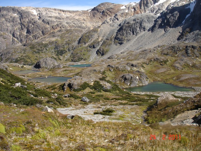 Em alguns lugares há uma pequena crista com árvores, vestígios de uma morena lateral no meio do vale, entre os campos de turfa. As vezes a trilha seguia por ali. Perto do final do vale a laguna Arco Iris. Nada de excepcional. Alguns patos e gansos pousados na água. Este último trecho é cheio de alagadiços e cansativo.