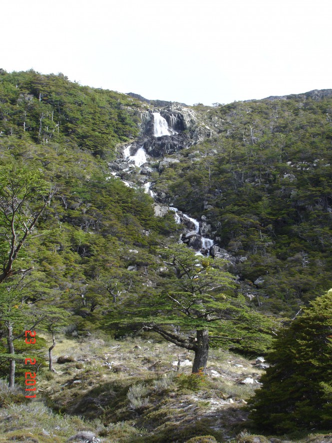Logo antes do rio Torito fazer uma curva virando para o Norte, rumo ao lago Fagnano, ficava o ponto do GPS. Mas cadê a trilha? Um pequeno paredão de pedra dificultava a subida. Como a trilha ia em frente supus que a subida deveria ser mais adiante. Entrei numa floresta de lenga onde vi que costumavam acampar. A trilha desaparecia, mas dentro da floresta era mais descampado e dobrei a esquerda começando a subir por entre as árvores espaçadas. Logo começou a dificuldade com subida íngremes, apenas indícios indicavam que gente passou ali.