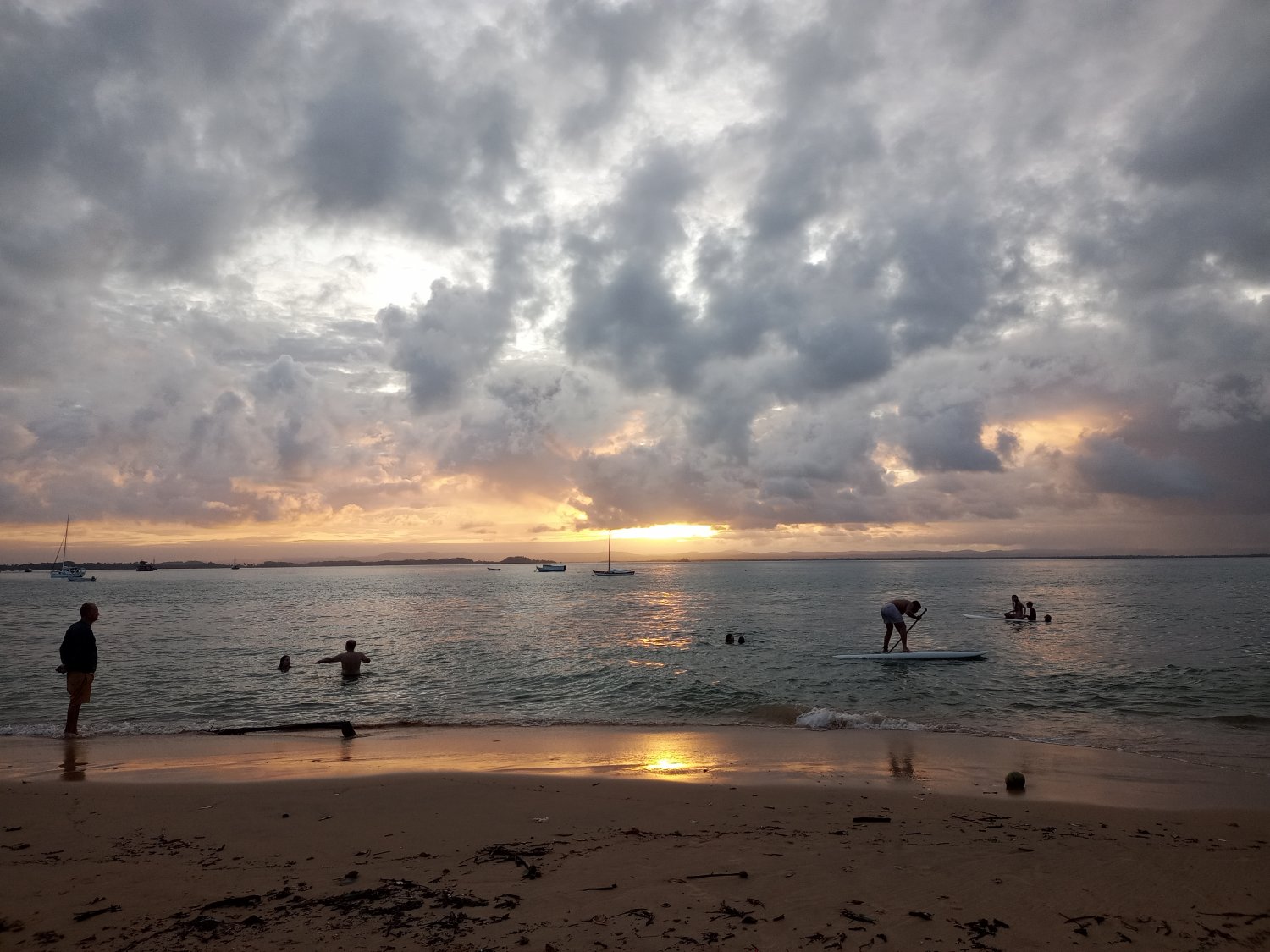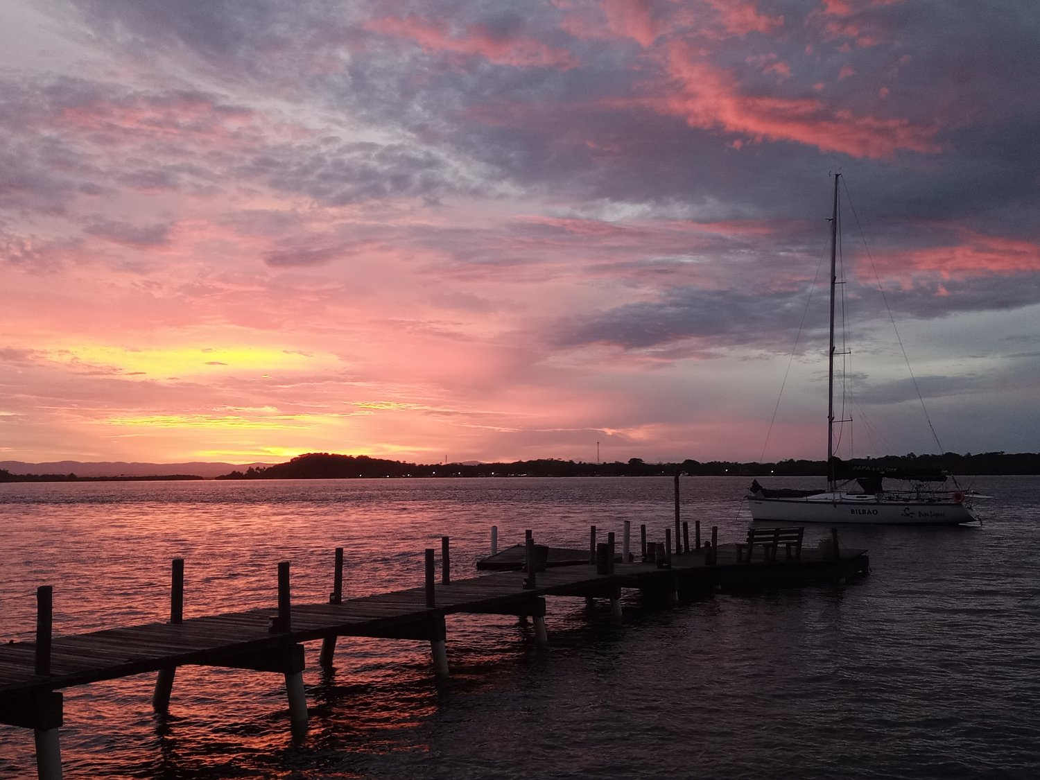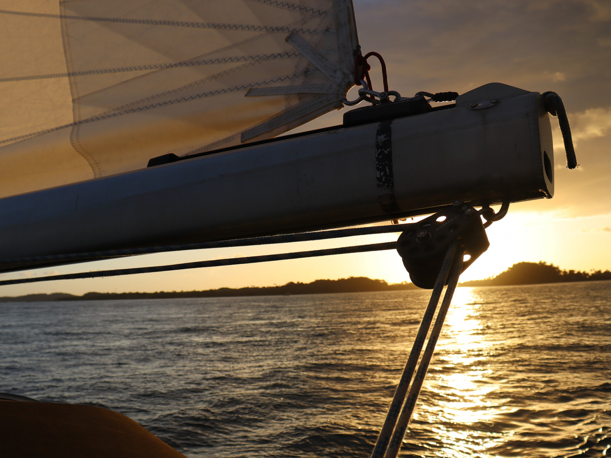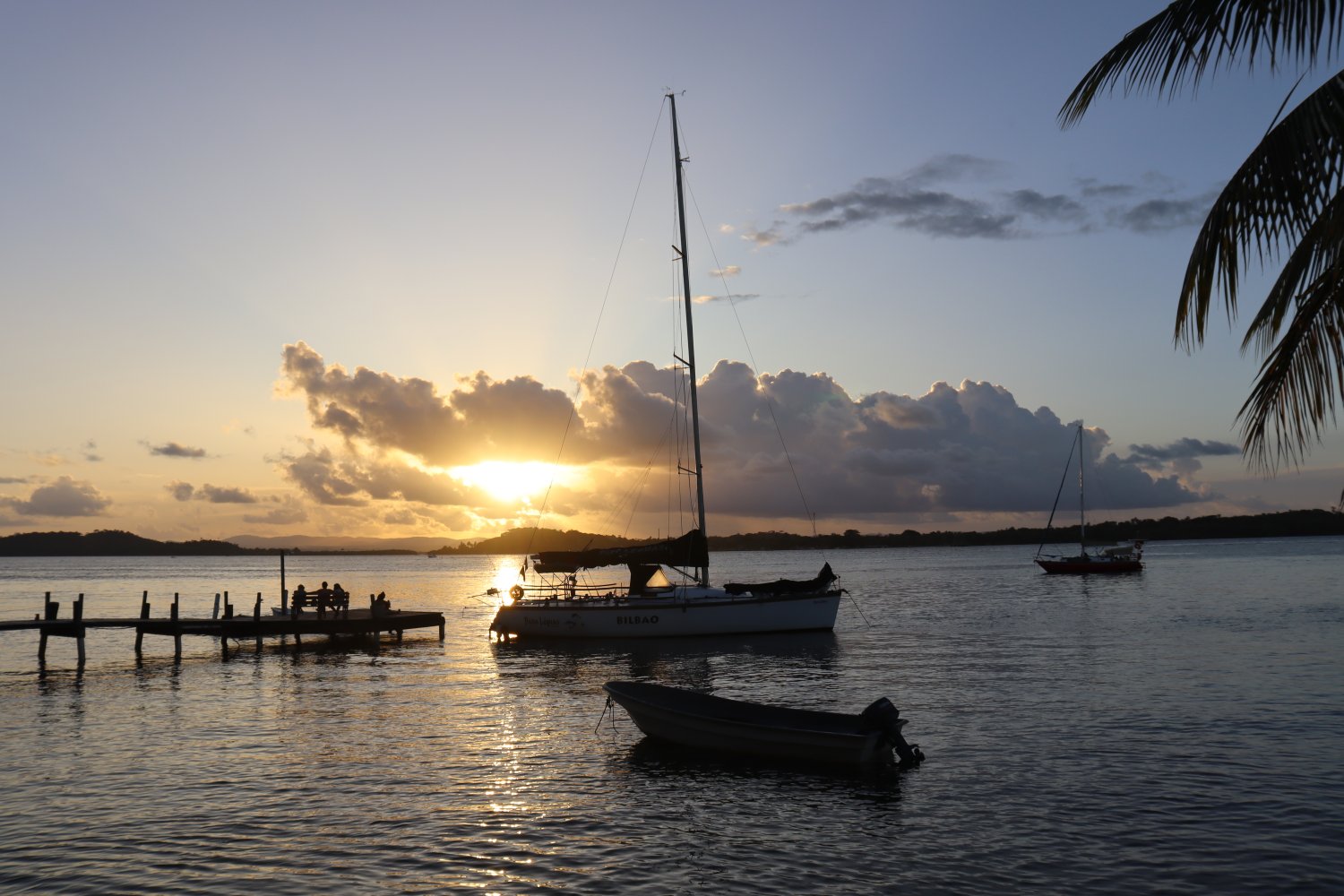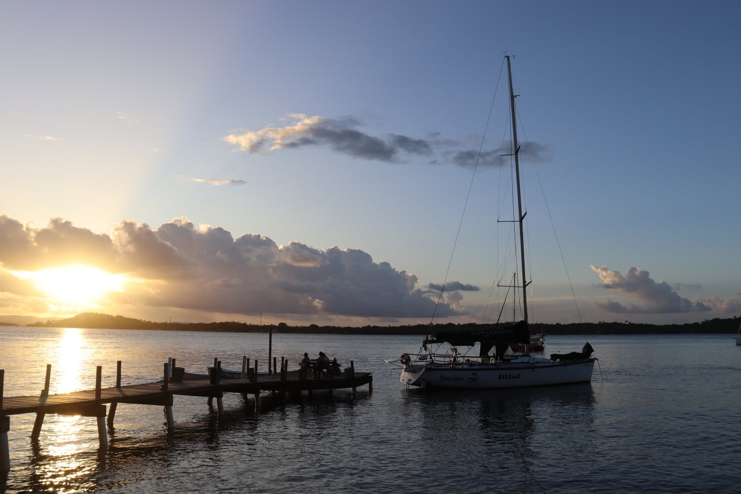 Entramos com um pôr-do-sol lindo, após 8 horas de navegação. Fomos um pouco além de Barra Grande, para um local chamado de Campinho, mais dentro da baía, mais abrigado.