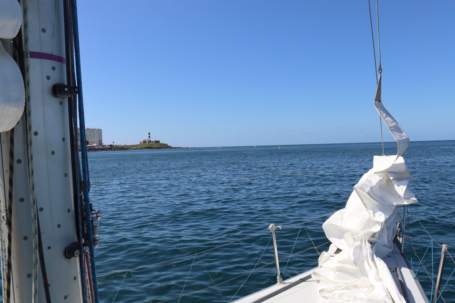 Partimos sábado 9 da manhã do Iate Clube da Bahia. Na barra da baía içamos velas. Começou assim uma velejada deliciosa. Estávamos em 10 a bordo. Um NE ou E empurrava o barco. Cerveja e boa música. Apesar do mar relativamente calmo uma das passageiras precisou do balde...