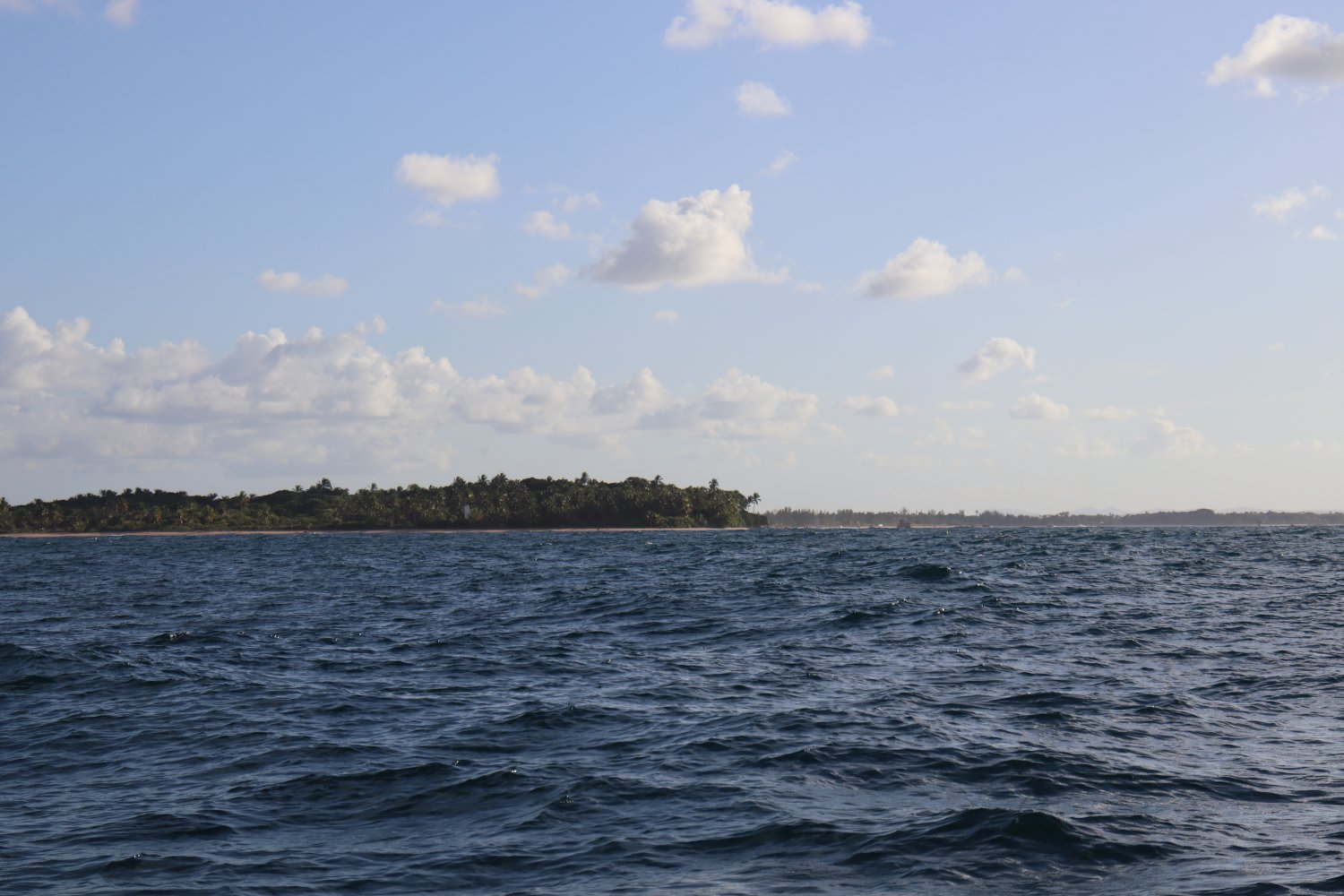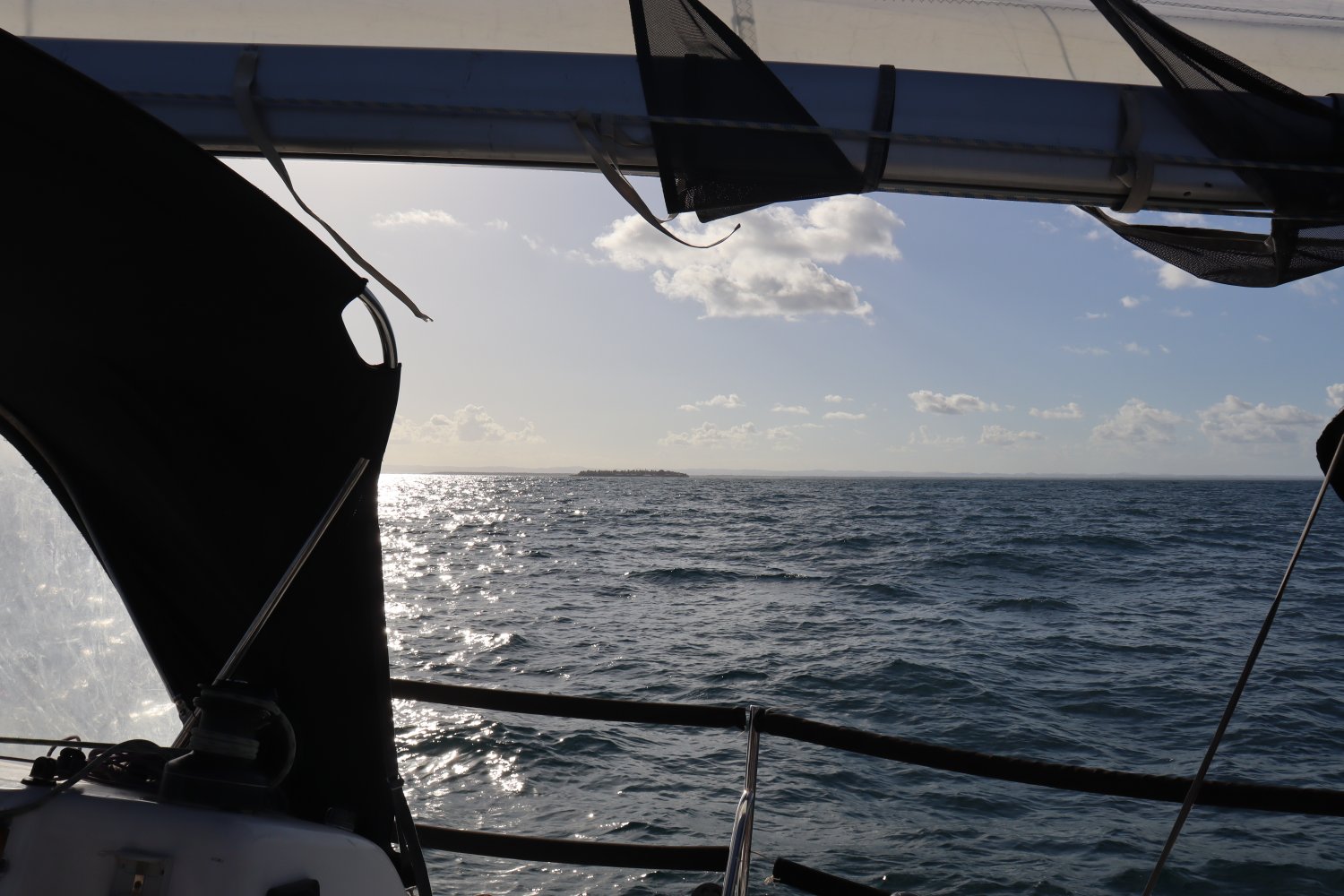 A ilha de Kieppe no horizonte a boreste. Pertence ao grupo Odebrecht. Observe como temos que passar distantes dela.