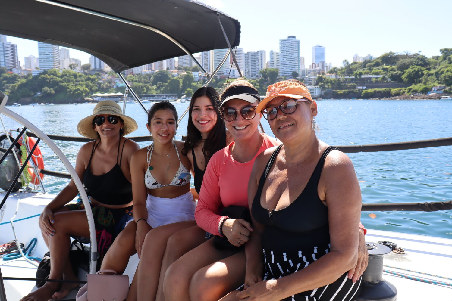 Tripulação feminina (da esquerda para direita, Cleia, Valentina, Mirla, Lucia e Maria). Ao fundo o Iate Clube.