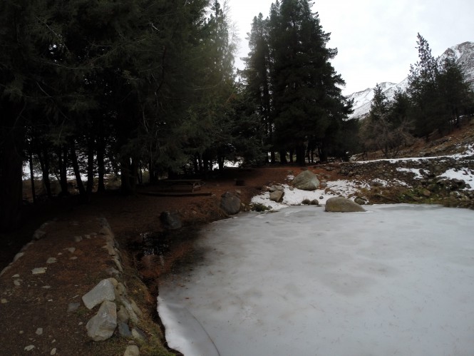 Comecei a caminhar às 10 horas e levei cerca de uma hora para Vila Paulina, bonito local de acampamento organizado, WCs, mesas/bancos para picnic e locais para fogueira. Apesar de estar a quase 2.000 m, debaixo dos pinheiros não havia neve.