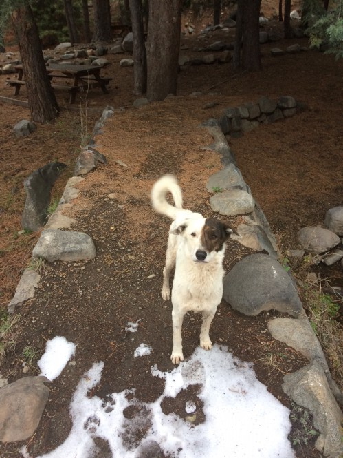 Solo ruim, cheio de pedras, difícil de enfiar espeques. Havia trazido espeques mais apropriados para a neve. O viralata reapareceu (pensei que tinha baixado para a portaria dos guarda-parques). Teria companhia para jantar.