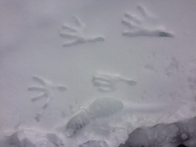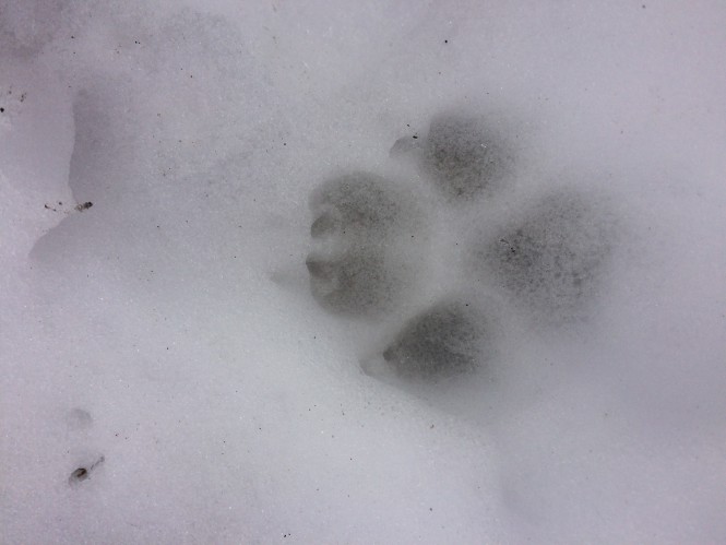 A caminhada ficou muito cansativa com as pernas afundando na neve. A progressão estava lenta. Sempre que podia eu pisava sobre pedras, onde elas ainda estavam visíveis, seguindo o exemplo da raposa, cujas pegadas pareciam seguir a trilha (estavam no rumo certo). Quando via que até as pegadas dela estavam fundas na neve pensava, “aí ferrou”. Um bicho esperto destes está atolando na neve, imagina eu.