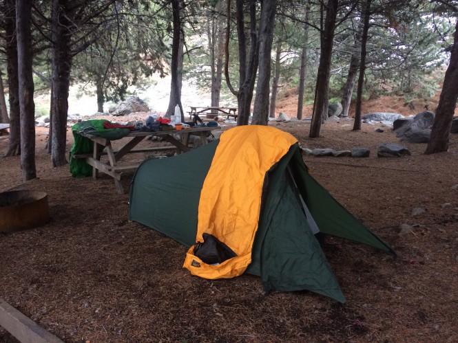 Cheguei de volta a Vila Paulina cerca de 16:30, onde montei a barraca na área de acampamento em meio as árvores, com a mordomia de ter ao lado uma mesa e banco.