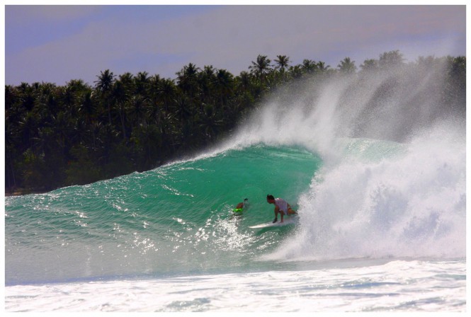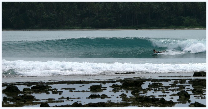 The peak to surf in Nias is Sorake Beach, but there are other possibilities, less known. The Sorake wave is a perfect right one. To reach the peak just fall into the Keyhole (deeper are at one point of the reef) and swim to the left, so you get smoothly behind the waves. Just drop, enjoy, and when leaving the wave paddle a little to the right to join the watercourse and go back to the peak.