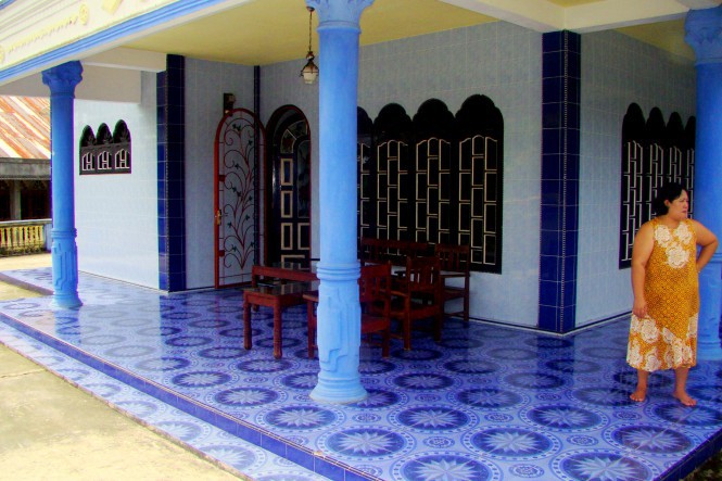 The adventure is pretty crazy because the road took about an hour in a motorcycle without helmet with unusual scenes. We understand that everyone here horn, but it is not stress! We saw people walking all the time on the road, poor bridges that sometimes made us get off the motorcicle to pass, geese crossing queued, fighting cock cage at the side of road, a woman washing clothes in one of the tracks using asphalt, pig crossing, children drawing on the road with pieces of stone. Also had a runway covered with rice drying after harvest. Of course all the time, as we passed people stopped doing things to look and greet us. We were real aliens. The paisage was amazing, with rice paddies on both sides of the way, and the houses of the villages, in their own styles. We went through one of the villages where the houses were built as if they were boats. Cool. It was an hour ride of a great adventure.