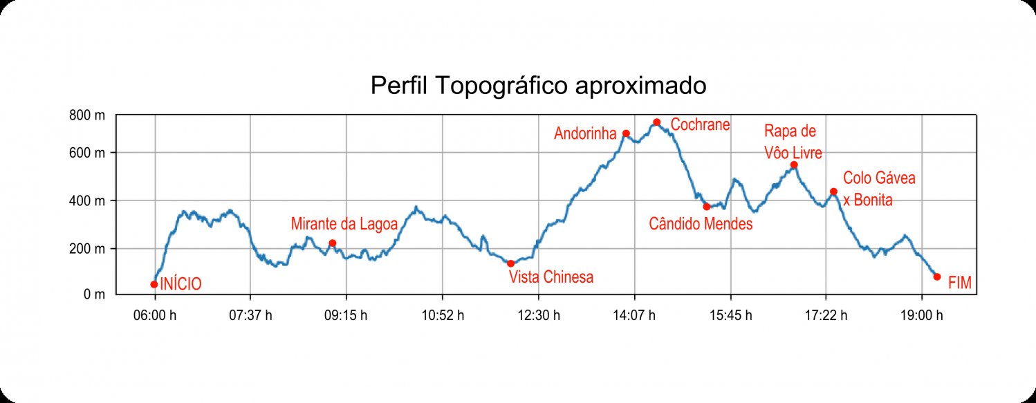 O tempo já estava totalmente encoberto e ventava moderadamente. A meteorologia previa chuva no final da tarde e a gente já não tinha dúvidas disso. A combinação estava perfeita para a chegada do pé d’água: dia extremamente abafado pela manhã, ventania após o meio-dia e nuvens carregadas no meio da tarde. Nossa foto na rampa da Pedra Bonita já foi quase sem paisagem e as últimas decolagens de asa delta aconteciam entre nuvens. Às 17:00 horas a água estava prestes a cair, mas não estávamos contentes em fazer a BoBô (Botafogo - Bonita) ao invés da BoBa. Decidimos então tocar para o trecho final.
