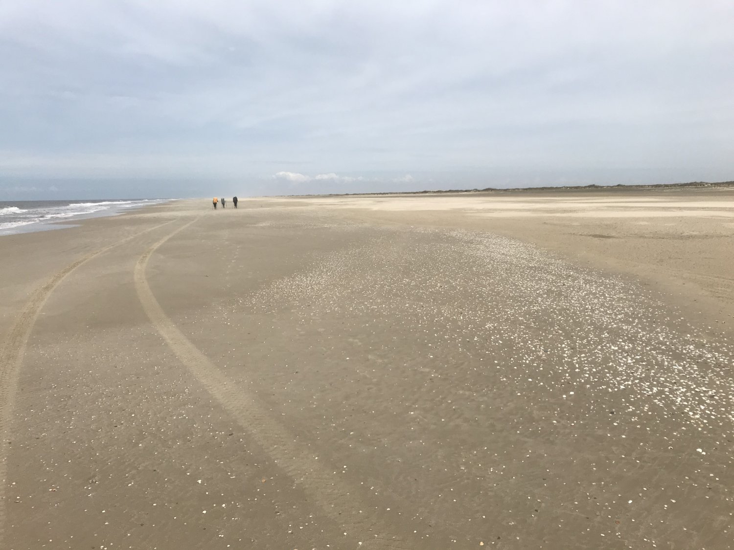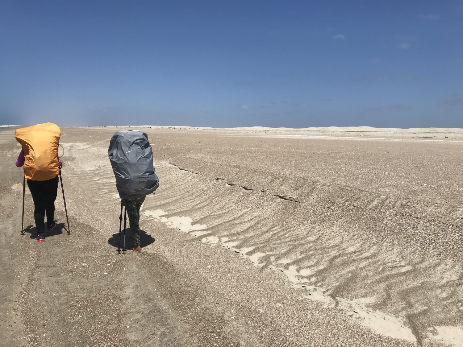 Acordei cedo e comecei o quarto dia em um ritmo bem firme de caminhada. Após 40 minutos, tive uma surpresa. Avistei, bem distante, três pontinhos se movimentando e saindo das dunas em direção à parte firme da areia. Algumas horas depois acabei alcançando as três gurias que seriam a minha companhia até o final da travessia.