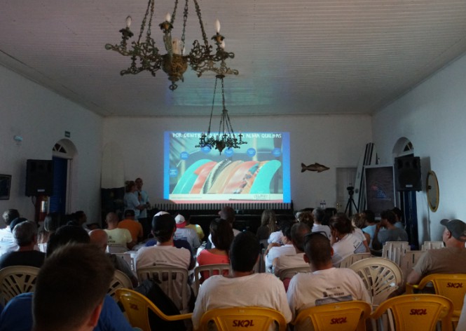 Na manhã seguinte tínhamos um céu cinzento e a ausência de vento, proporcionando uma ótima condição de surf e para melhorar a primeira palestra era do Phill... Phill Rajzman, atual campeão mundial de longboard!