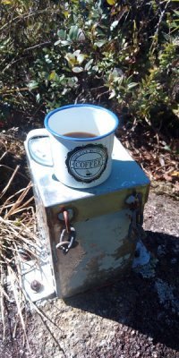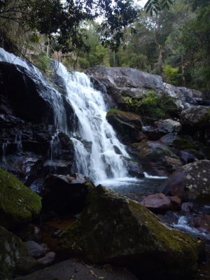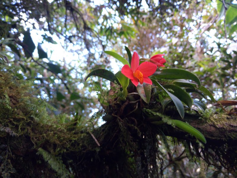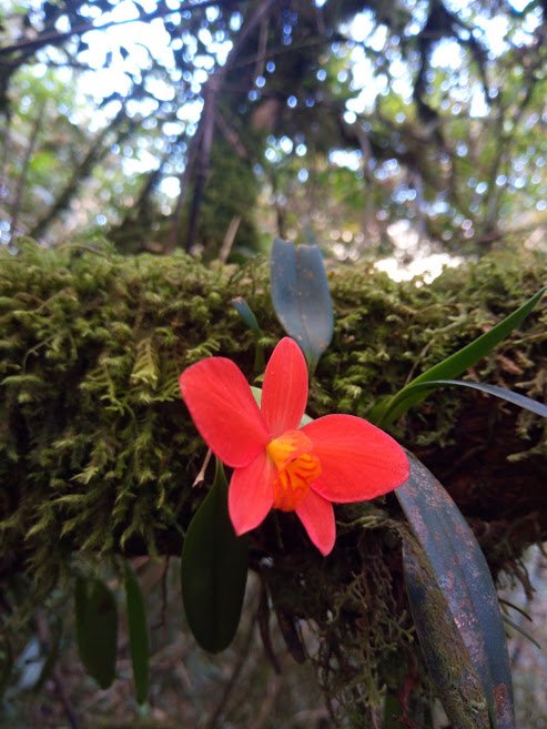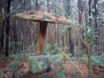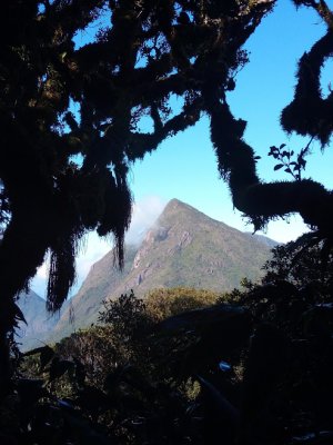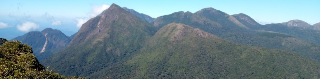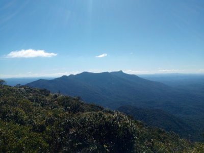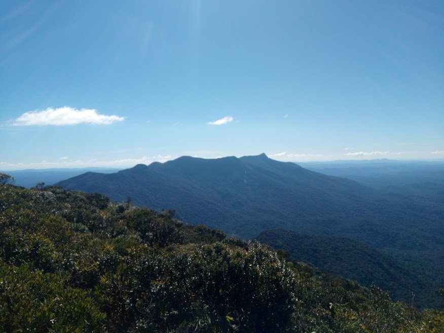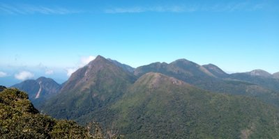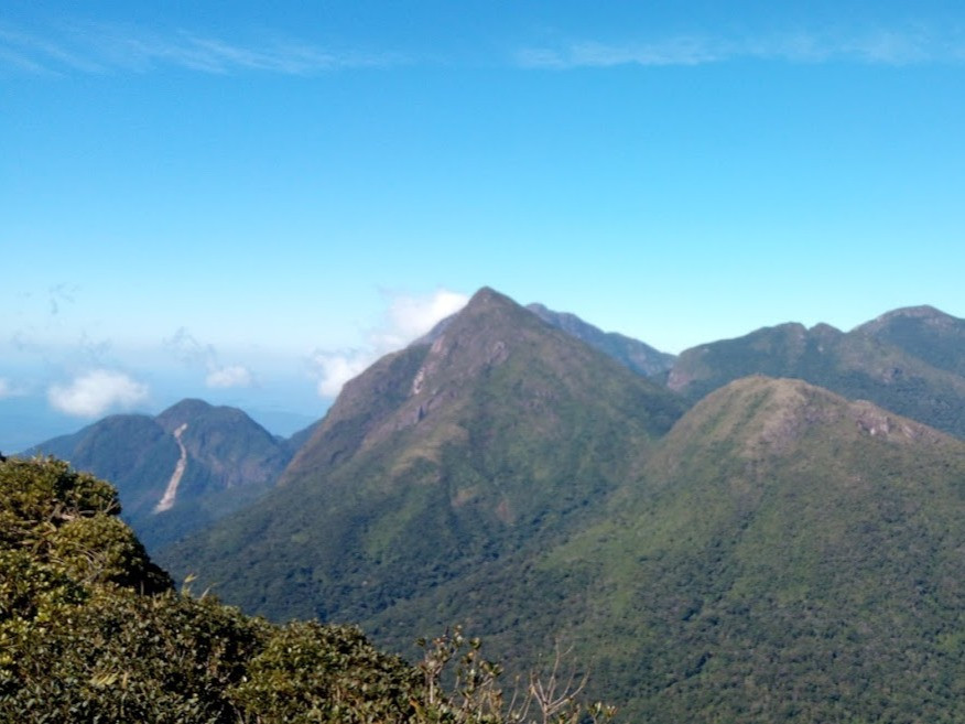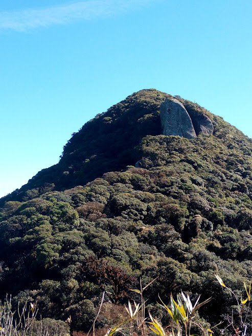 Montanha com trilha em mata fechada. Em seu cume é possível observar várias montanhas da serra do Ibitiraquire e do Capivari.