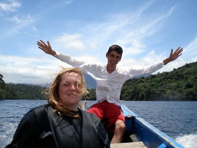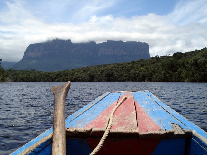 Chegamos e logo de cara soubemos que o roteiro tinha sido alterado e que iríamos naquele mesmo dia pro Salto Angel! Só tivemos tempo de trocar de roupa e montar uma só mochila com o que levaríamos para lá! Conhecemos um casal de brasileiros que foi com a gente, a Giovana e o Rodrigo, e também um casal de eslovacos! Caminhamos cerca de 20 a 30 minutos para chegar ao Puerto Ucaima e embarcamos na canoa motorizada que nos levou até o Salto Angel! A viagem durou cerca de 04 a 05 horas e foi maravilhosa e emocionante!!! O tempo todo acompanhando enormes tepuys e suas cachoeiras, paisagens lindas e cruzando vários “rapidos”, que são corredeiras onde o barqueiro tem que fazer uma manobra radical para não encalhar, e por isso ele tem que conhecer muito bem o rio!!