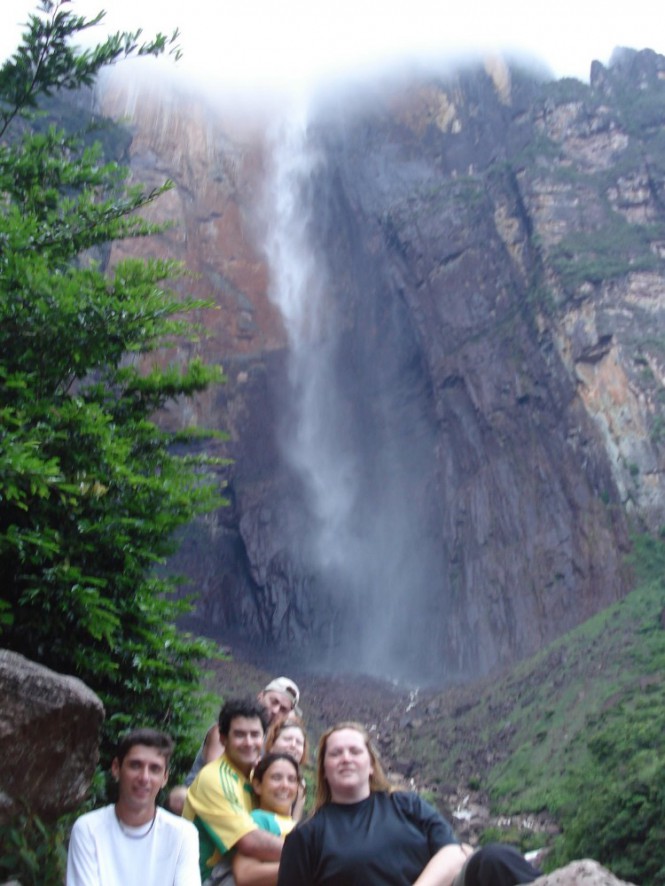 Paramos para lanchar no Pozo de la Felicidad, uma cascata pequena onde se forma uma piscina natural de águas cristalinas e depois continuamos viagem até o local de acampamento, porém fomos direto, por uma trilha de 01 hora, até o mirante que fica na base do Salto Angel! No caminho tropecei em umas das muitas raízes que cobrem o chão e bati o osso da perna em uma raiz... Senti muuuita dor, mas continuei caminhando. Chegamos as 16:00 hs no mirante e o alto da queda estava encoberto pelas nuvens... Tiramos várias fotos, mas eu ainda tinha esperança que o tempo abrisse! Como estava ficando tarde e a trilha é toda em floresta fechada o nosso guia quis voltar antes do tempo, para não escurecer no trajeto..