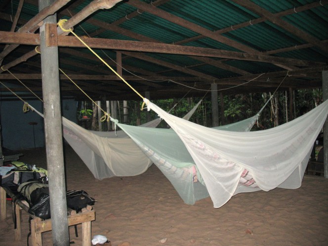 Voltei contrariada e um pouco frustrada por não ter visto a queda por completo, mas valeu a pena de qualquer forma!! Cruzamos o rio de canoa e nos alojamos em nossas hamacas (redes) com mosquiteiros e coberta. Jantamos um frango na brasa, papeamos um pouco e logo fomos dormir. O Ernesto (guia) explicou como teríamos que dormir nas redes, para não acordar “feito bananas”, segundo palavras dele!! Rs... O certo é dormir na diagonal da rede, para ficar o mais plano possível!! E até que dormi bem!!