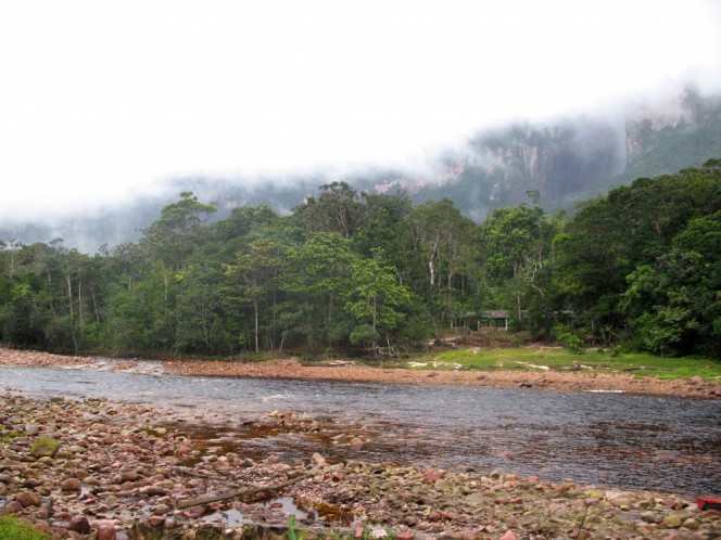 Acordamos bem cedo com o barulho de um (mal educado) grupo de gringos que foi sentar ao lado das nossas redes, esperando alguma coisa, conversando e rindo animadamente, sem a menor preocupação com a galera dormindo!! Levantei e vi que o tempo estava totalmente fechado, acabando com qualquer chance de ver o Salto Angel dali, pois ele fica bem em frente ao acampamento! Tomamos o café da manhã, ajeitamos as coisas e voltamos de bote para Canaima.
