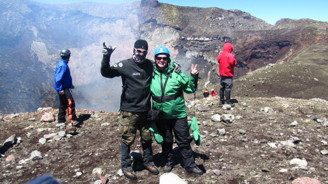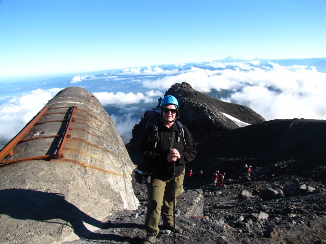 A certa altura o gelo acabou e a parte final foi pelas rochas. Aí já posso dizer que minhas pernas estavam lá somente como meras figurantes! Rss... Os últimos metros da subida foram no piloto-automático e na vontade de chegar!! Chegando no topo (quase 13:00 hrs) cruzamos com o nosso grupo descendo! O guia principal veio me dar parabéns e eles desceram pra encontrar com o casal que desistiu. O Christian tbém me deu um abraço de parabéns e claaaaro que eu dei uma baqueadinha, mas não cheguei a “abrir a boca”, como de costume!! Kkkk... Larguei minha mochila com ele e fui lá pra perto da cratera!! Nunca me imaginei num lugar daqueles e nem como seria! Fiquei ali observando a grandiosidade daquilo tudo, o tamanho da cratera, as rochas de várias cores, algumas partes amarelas por causa do enxofre e a galera andando por toda a borda!! Como eu estava respirando pela boca, o gás ía direto na minha garganta e ardia! É muito forte o cheiro lá em cima! Não tive muito tempo pra andar, mas tirei várias fotos e curti o que pude, pois tínhamos que alcançar o grupo!