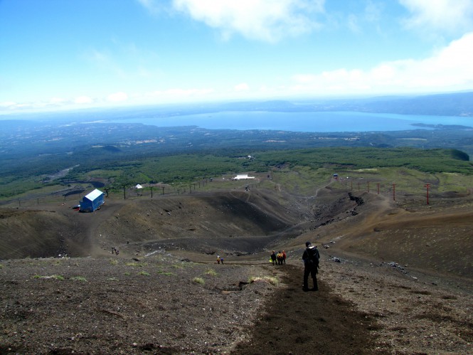 Hoje eu até dou risada contando, mas eu passei medo mesmo. Depois conversei com vários conhecidos e amigos que já subiram o Villarica e se divertiram um monte nessa descida, como se estivessem em um parque de diversões, mas eu não! Pra não dizer que foi ruim o tempo todo, tiveram uns dois ou três trechos que a inclinação era pequena e eu pude curtir a descida e apreciar a paisagem e o Lago Villarica lá embaixo!! :)