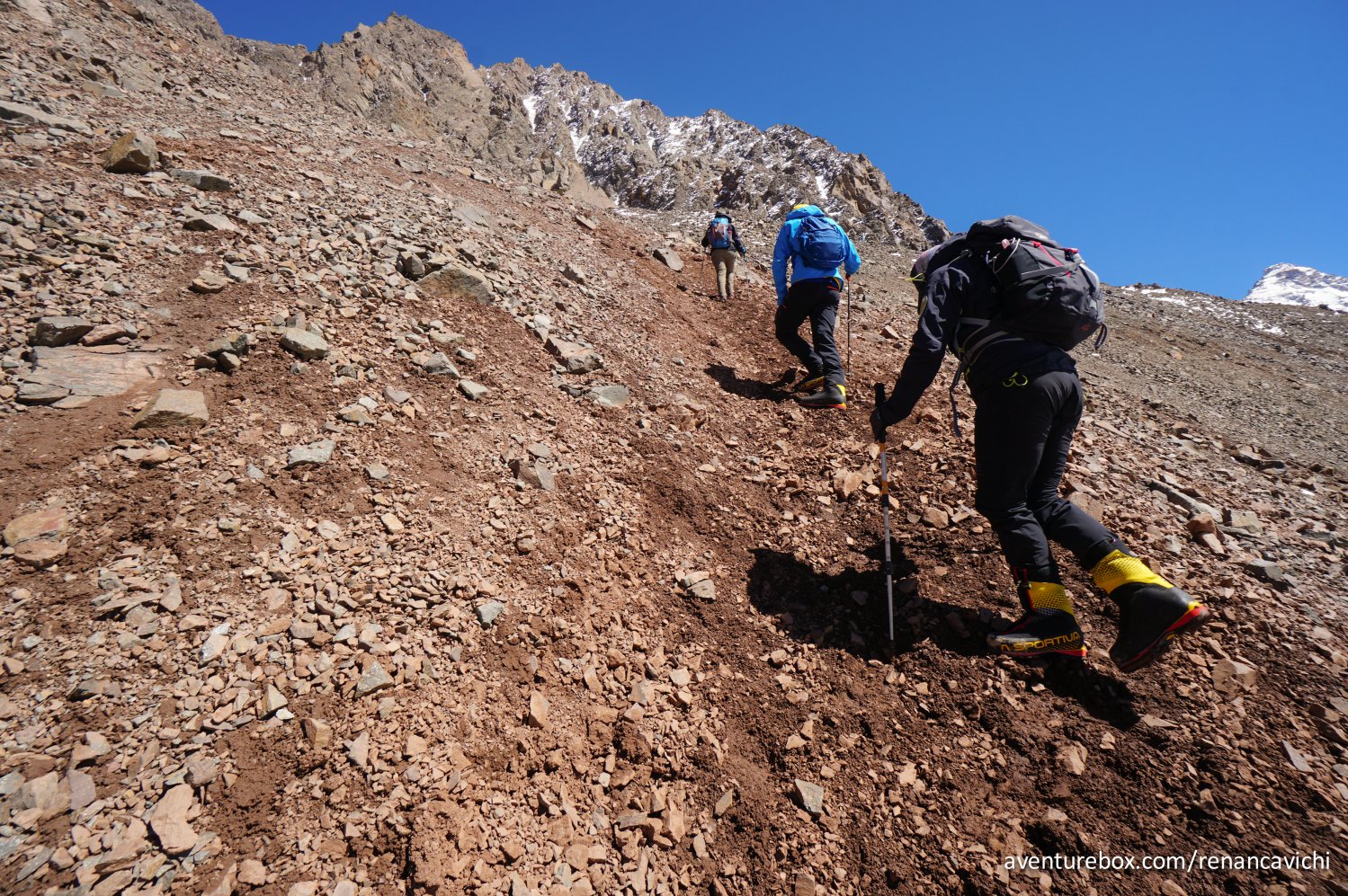 Ao fundo o gigante ia se tornando cada vez mais imponente. Sem dúvida, esse caminho para o Cerro Bonete tem uma das vistas mais lindas do Aconcágua, na minha opinião. Às vezes eu parava alguns instantes e ficava perplexo com a imensidão. É dificil descrever essa sensação. Acredito que só aqueles poucos que se aventuram nas montanhas sabem o quanto a grandeza delas é impactante ao olhar.