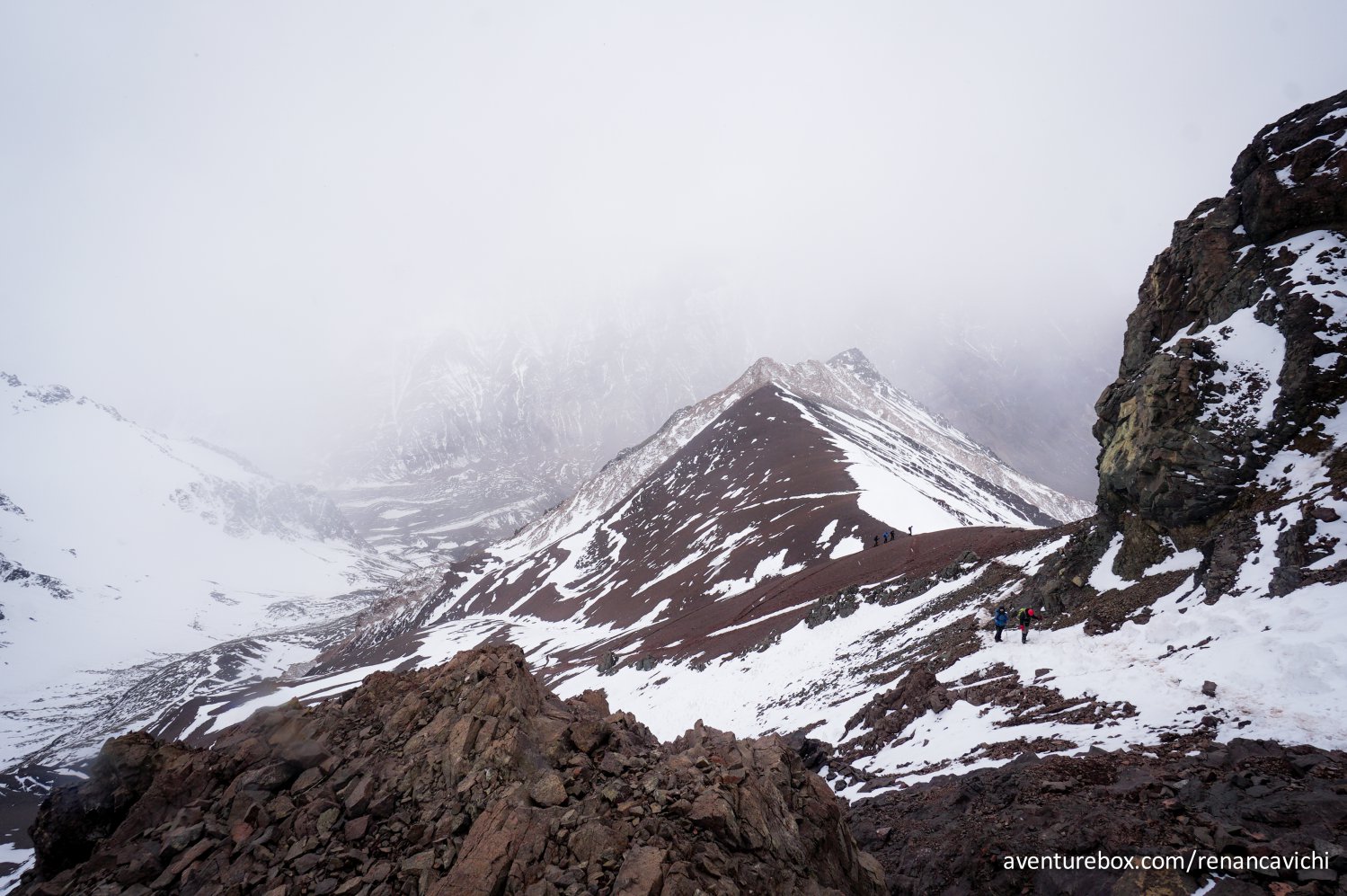 Nesse momento com as condições adversas, o corpo e a mente começam a se proteger e querer retornar. O montanhismo, nesse momento, passa ser um exercício incrível de controle emocional, seguir em passos curtos e respirar profundamente se torna um mantra. Ainda mais, para ajudar, estava bem apertado e começando a sentir cada vez mais frio. Me senti muito melhor depois de fazer um xixi a 5 mil metros, é muito revigorante e com uma vista incrível! :D