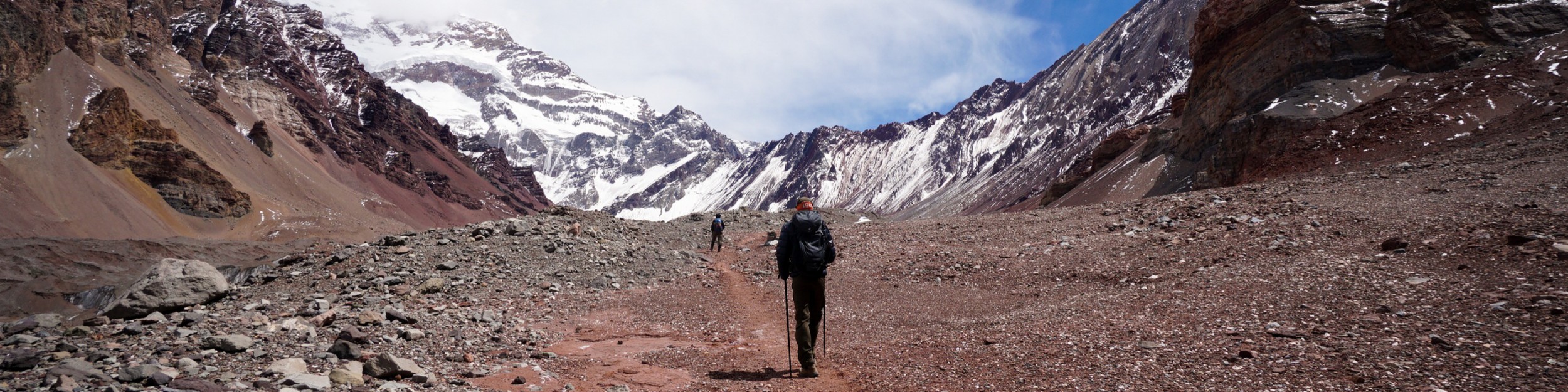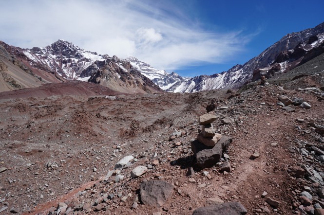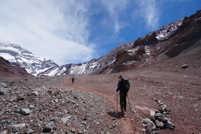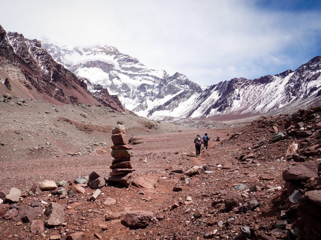 Seguindo para direita não tem erro, o percurso todo sobe por um vale com montanhas rochosas bastante íngremes à direita e do lado esquerdo, à distância, é possível avistar o Aconcágua que vai mostrando sua imponência a cada passo.