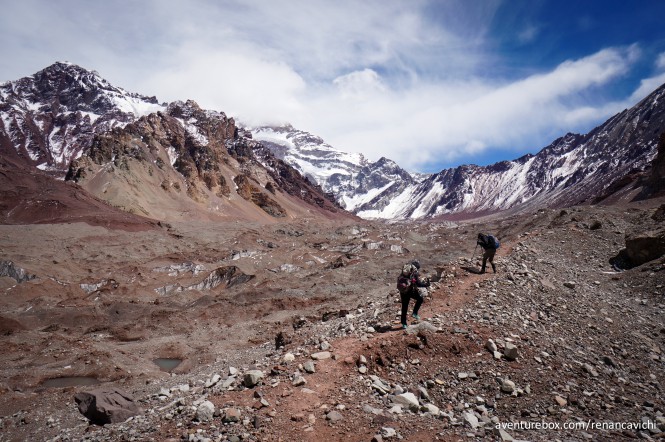 Nesse dia a proposta era fazer um ataque a Plaza Francia, uma área de acampamento pouco usada que fica ao final do vale que leva até a face sul do Aconcágua. Pelo que entendi, esse acampamento é usado por escaladores que tentam as vias mais técnicas e perigosas da parede sul, mas não possui nenhuma infraestrutura do parque.