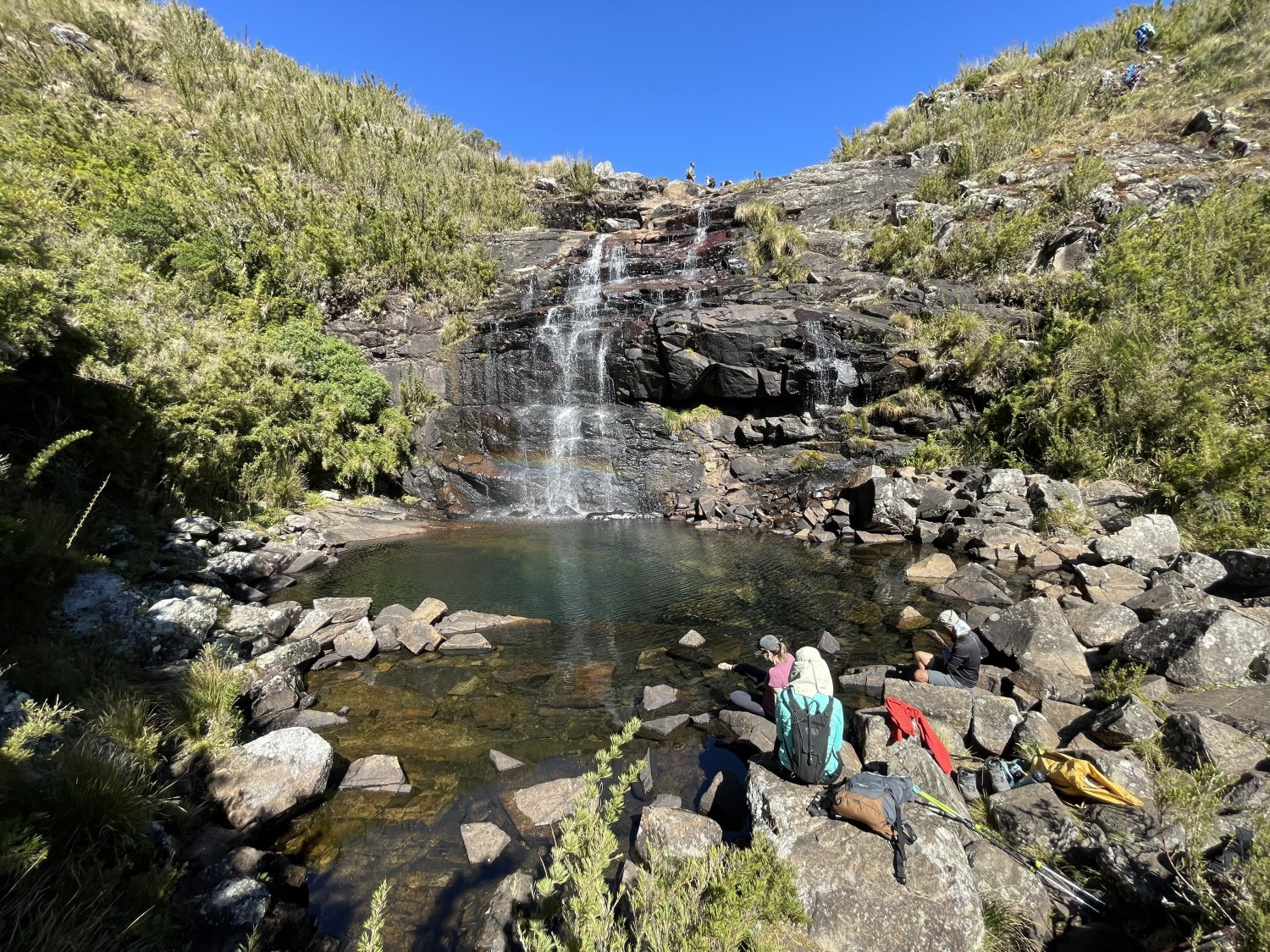 Estava um dia muito bom para trilha, compartilhamos a maior parte do trajeto com corredores de montanha que participavam de uma competição. No meio do caminho, decidimos fazer uma parada na Cachoeira do Aiuruoca. Como passaríamos do lado, e boa parte da turma não conhecia a cachoeira decidimos estender um pouquinho. E valeu muito a pena! A descida é íngreme, exige um pouco de cuidado, mas nada super difícil. A Cachoeira do Aiuruoca é linda, completamente rodeada pelos paredões de vegetação, como se fosse um corte no meio do vale. Como a água estava em "temperatura de freezer", ninguém criou coragem para um mergulho. Mas a pausa de frente para a cachoeira foi muito bem-vinda.