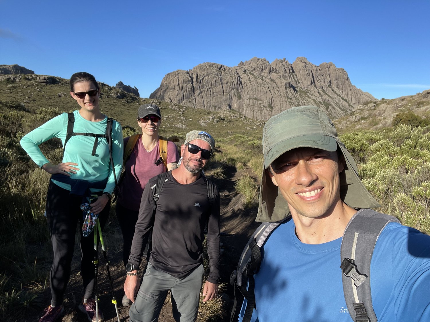 Hiking MontañismoEm um sábado de Junho, eu, a Ana, o Jeff e a Cris combinamos de fazer a trilha de Ovos de Galinha no Parque Nacional do Itatiaia (PNI). Nos encontramos no abrigo Rebouças, onde após uma noite bem gelada para Jeff e Cris que acamparam, iniciamos a trilha. A trilha passa em frente as Agulhas Negras, por trás da Pedra do Altar, e segue adiante, sentido Pedra do Sino.