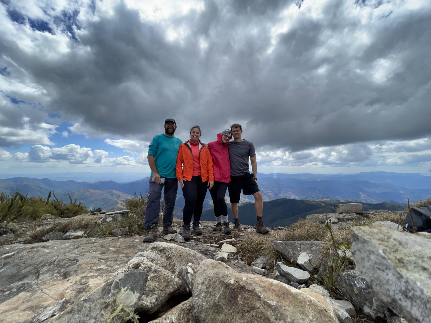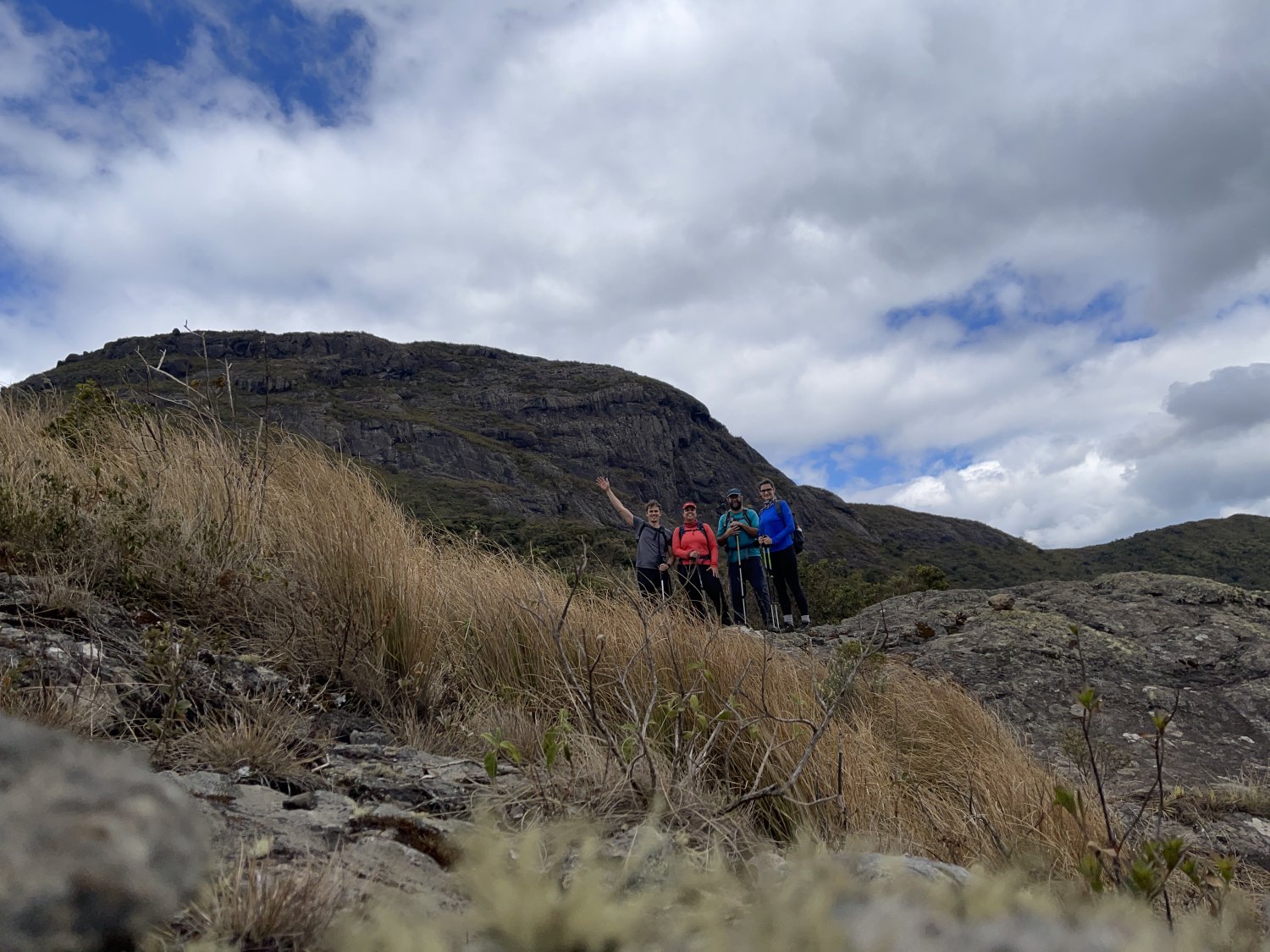 Antes do pico da Pedra Preta, chega-se primeiro ao cume da Pedra Pequena, que já tem uma vista incrível da região e vale uma pequena pausa para descanso. Seguindo em frente, descemos um pouco para voltar a subir em direção ao cume da Pedra Preta.