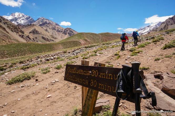 A caminhada começa por uma planície com alguns lagos e caminhos demarcados para os visitantes do parque. Muitas agências de turismo de Mendonza levam visitantes para conhecer essa entrada do parque onde podem caminhar, conhecer um pouco sobre o Aconcágua e curtir o visual das montanhas. No entanto, esse passeio termina em uma ponte de madeira alguns metros à frente, dali em diantes apenas pessoas com permissão para o trekking podem seguir.