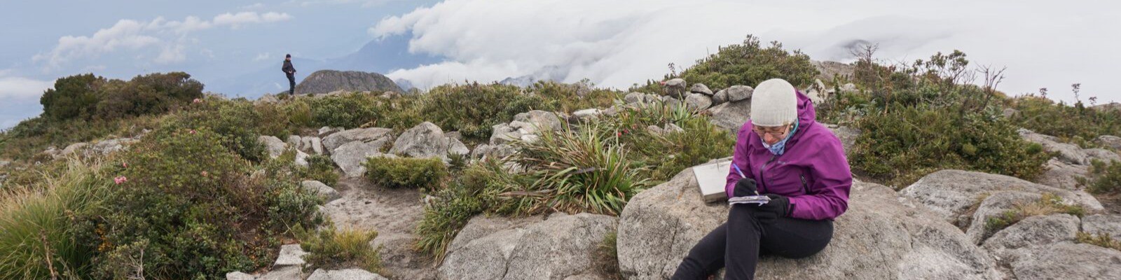 Chegando ao cume, aos poucos, o tempo começou a abrir e tivemos o privilégio de assinar o livro do cume com uma vista linda do por do sol e o mar de nuvens cobrindo parte da Serra da Mantiqueira.
