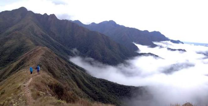 Saimos por volta das 8h30 da manhã do acampamento e começamos a caminhada. O segundo dia passa por várias cristas com trechos de escalaminhada em pedras e mato alto com bambus e galhos entre uma crista e outra.