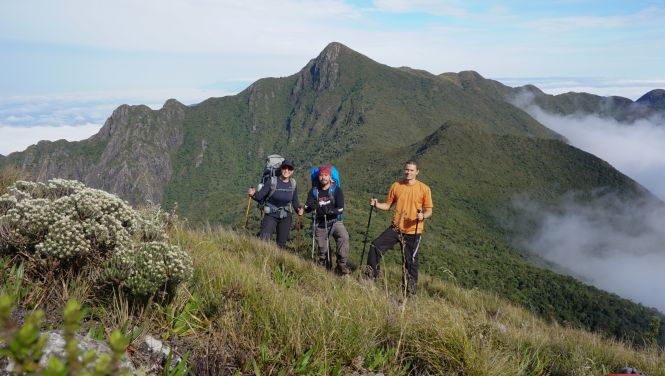 Pegamos a trilha passando por trechos de capim, mato alto, bambu e escalaminhada, mas nada disso foi tão crítico como a força do vento nas cristas. Eu nunca presenciei um vento tão forte! As rajadas carregadas de umidade não permitiam caminhar normalmente, foi preciso usar a força contrária do corpo e se apoiar nos bastões para conseguir caminhar lentamente nas pedras.